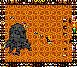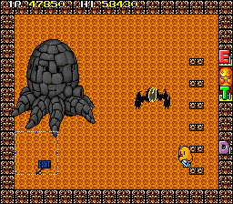 It's not quite as complicated as the first boss, but the Stone Octopus can give you some trouble if you're not careful. Once it pulls itself together, it'll move up and down, periodically spitting ink from its snout that quickly turns into a cloud of bats that lazily home in on you. By that, I mean they will always move forward and try to adjust to your vertical position but only once, so it won't try to correct direction if you move. You can shoot the bats, but there's a whole cloud of them, and if you're bad with your aim, they'll get you. Complicating things is the weak spot- you can only hit it in the snout, precisely where the ink shots come from. This isn't a problem if you've got a Laser, mind, as it'll blast through all the bats. Keep your vertical position fairly close to the Stone Octopus to get the shots on the snout and also make a quick escape when it fires its bats, and sooner or later...