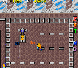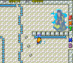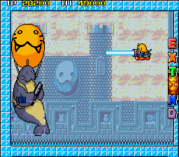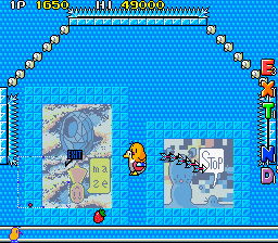 The action shifts to Mt. Cook now, with the volcano motif being dumped in favour of ice. This means the ground is now slippery and Tiki will continue to move even after you let go of the control stick, but you can stay in place by jumping straight up- he won't maintain his momentum in the air but will continue to slide when you land, so use this to give yourself a moment to think. With the change of environment comes one final change to the game, an especially cruel one- there are no more checkpoints and dying sends you back to the start of the round, no matter how far you got. This is a classic Taito dick move, although it could've been worse, it doesn't disable continues like in Rastan or lock you into a bad ending like Operation Thunderbolt and S.C.I. - Special Criminal Investigation. It at least makes sense for Round 5-3, as it's a big aerial maze, but Round 5-4 not having checkpoints is just cruel.