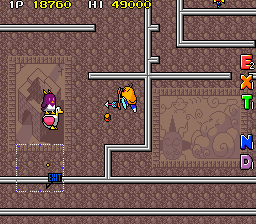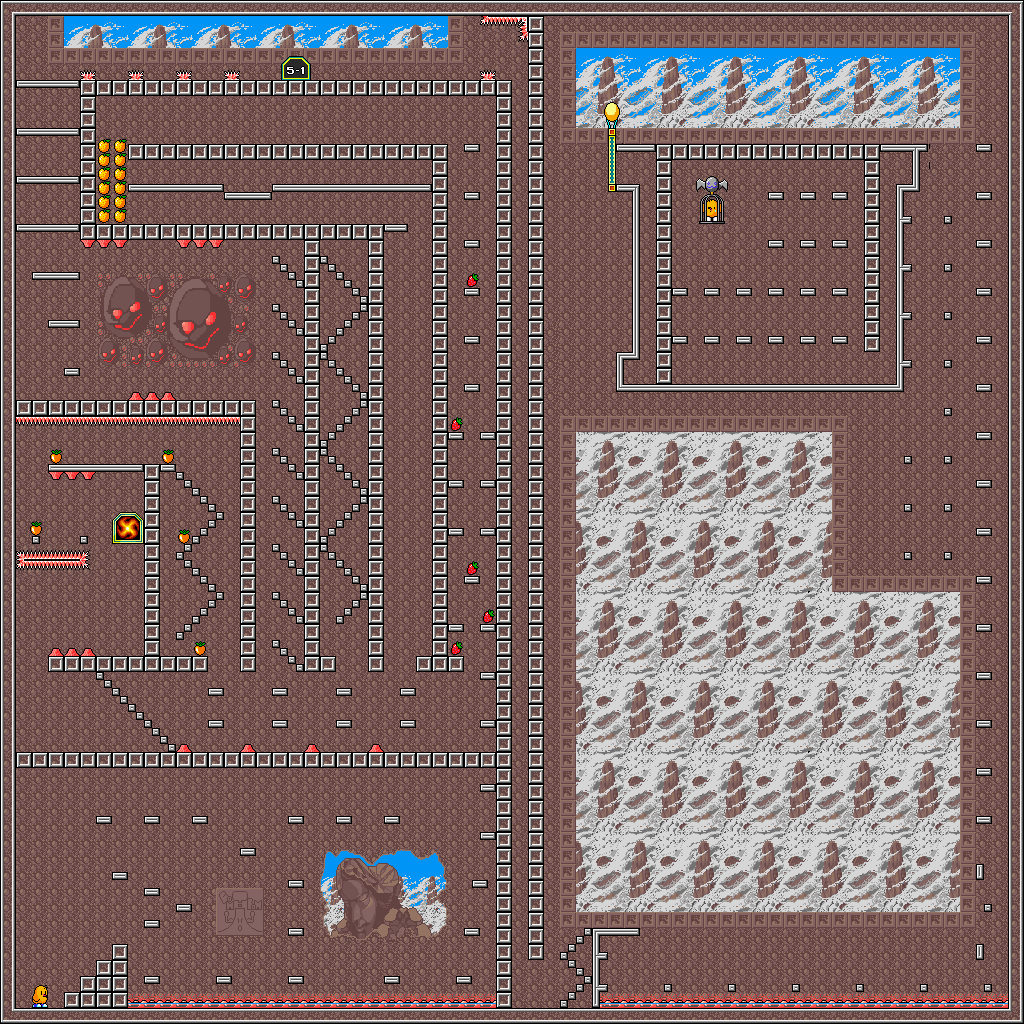 Probably the most intricate maze in the whole game, Round 5-2 is a bit of a long one. It's also my least favourite round in the game because it's a wee bit long and there's not much variety going on- just lava pits, the occasional cannon here and there, and until the very end you're only fighting Frankies. On the plus side at least, this has some neat background murals such as a fire being, the sun and clouds, and a cutesy adaptation of the Penrose stairs made famous by M. C. Escher's rendition of them. Sadly, aside from the fire being, you have to go out of your way to see them. Oh dear. Anyway, the first half is pretty standard as far as mazes go, with plenty of dead ends and the odd cannon here and there to spice things up. The main threats to watch out for are Frankies jumping between floors, the Mr. Wakelin in the upper-right you'll only meet if you get lost and the lower section where the sun and Penrose stairs murals are- you can fall down here and have to steal a Duck to carry on.
