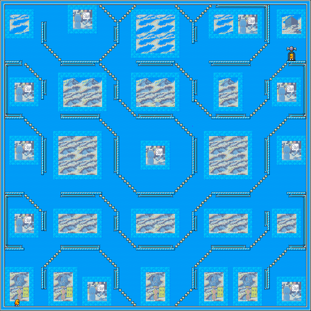Third floor! You get a break from spikes for now, but instead you've got to fight a selection of enemies with cloud platforms dotted about. These did show up in the last round, but they were mostly a non-factor, serving to block different parts of the maze. Here, you'll probably bump into them for the first time and find out they bounce you about, a lot. If you're on foot, you'll bump up a bit off the ground, but in a vehicle they can either only lightly move you or send you flying depending on how you hit them. This affects enemies too so they're going to be all over the shop! Luckily it's a short area and starts with a Bob and a Penguin spawning, so you can grab a Duck early. You'll have to lure them so you don't get hit- try hiding under the first staircase of cloud blocks, then jumping in after the Penguin throws a rock to get the jump on them- but as soon as you do, you're almost home free... Just watch out for the Spearmen when you have to descend near the end, they can catch you out if you're not careful.