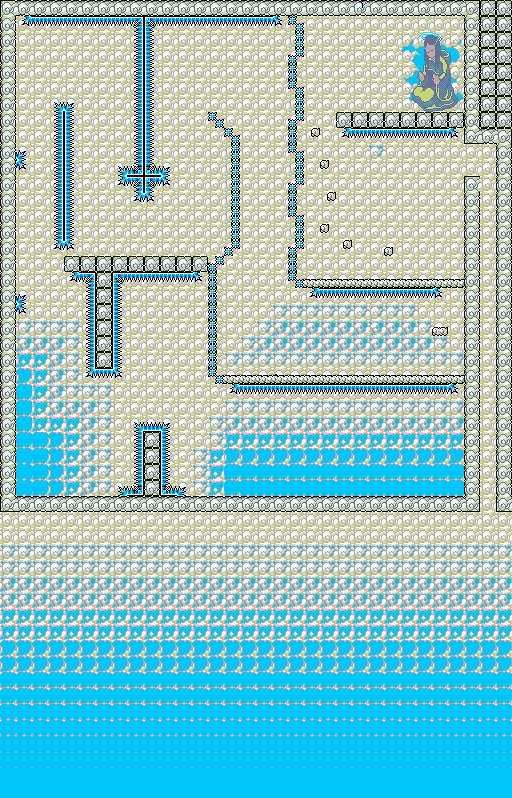 The next floor is more precision jumping over spike pits and on ice! Take out the lone Frankie before you carry on and make your way onto the thin platforms and start hopping. The trick here is to stick to the higher, smaller platforms for as long as you can, it's a lot safer. When the higher platforms stop (your visual clue is the J-shaped pattern on the background wall), you can just walk down to the lower ones and make your way across from there (there's some other higher-up platforms but they won't really help you). Again, queueing up your jumps, moving without stopping, and getting used to how momentum works on the ice is the key to success, as well as staying on your toes- Grim Bats and Winged Cats can sometimes spawn here. Once you reach the end, some stationary jumps (let go of the control stick!) will see you to the next floor- if you like, you can bounce off the wall on the second block there, then jump straight up so you don't have to mess with that third block to the right. This is the kind of tech that gets you through this final battle alive.