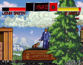 The man who would do anything from babysitting to agitating a revolution to get money. | Arena: Skyscraper The man who doesn't so much give an example of 'normal' but practically defines it, John Smith has a name so common it's often used as a placeholder pretty normal attire, and he looks like Harrison Ford. I think Namco were going for the 'All American hero' vibe here, but hilariously failed, as Johnny Boy here is wearing a daruma doll on his shirt (that you can buy a replica of nowadays). Unusual Japanese folklore aside, John Smith is a pretty standard character, willing to do anything- even babysitting- for money. FUN BONUS FACT: His running attack looks like a Dragon Punch. Shoryuken! | |