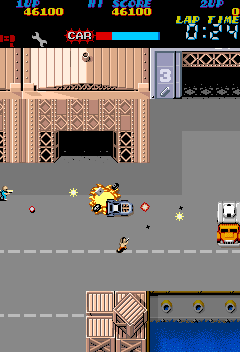 The opening section here actually isn't too bad- in particular, you'll get a ton of upgrades early on (a Gun icon first, then a Spanner and First-Aid Kit, two Speed icons and a Hammer on the far-right near the end) and most of them are on the beaten path so you won't miss them. The enemies are pretty standard stuff too, mostly normal cars and moving trucks (be sure to destroy them as you can't slip past them like at the start of the last area) and the only real threat is the water surronunding the port. Honestly, just run through here grabbing as many upgrades as possible and you should be fine!