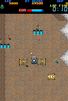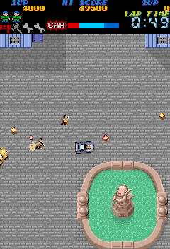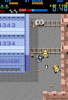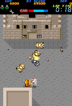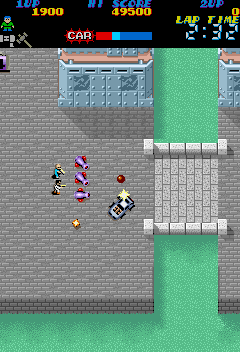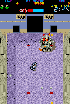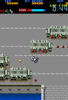 Welcome to Hell, Car Battler Joe. Zap Town is the final area and they really don't want you getting anywhere near the boss-man, the enemy pulls out all the stops to end your little roadtrip once and for all. Even in its opening section, Zap Town is no joke, as it begins with a series of winding streets littered with trucks, tiny turrets, cannons on rails, bomb rails, and snipers in almost every window. Your poor little jalopy is going to get more than a few dents in it, but while there's almost enough items to get yourself fully powered-up, they're all hiding down different sidestreets and you can't quite visit all of them. So, to get the most out of it, go right first and grab the Gun at the bottom of the screen, then go back left to find a Speed icon, keep going up for a Hammer, then turn right and head down for a Spanner, head up past the truck then right and up for a First-Aid Kit and a Speed icon later on, then once you reach a clearing, head all the way back left for a second Gun icon. Phew! All this time, try not to get killed- a tall order I know, but do your best.