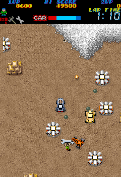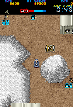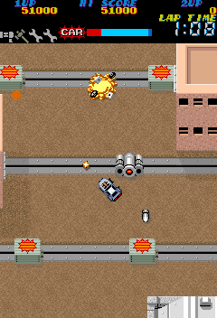 Both paths lead to a wide open area- at the start, head left and up for an awkwardly-placed First-Aid Kit- that's mostly more spike trucks that, again, you can actually sneak past. Just make sure enemy cars (including the buggies, back from Area 2) don't nudge you into a spike truck's path! Afterwards, the open area gives way to one hemmed in by water (as soon as the water appears, look around the left side to find a First-Aid Kit) and yet another new enemy appears, the spread-shot machine. These things are everywhere and slowly move around once you wake them up, and while their shots are very weak, they're yet another one-hit kill enemy. There's a bit of luck involved here as it's very possible for other cars to slam you into the spread-shot things, but just be careful, stay away from the left side (there's water over there) and do not engage the machines in groups- try and find another way around. At the very end of this area, you'll encounter those conveyor belts with bombs again, and while there's only a few conveyors this time, they're a lot longer and there's far more bombs on them. If you're going to die anywhere on this stage (aside from trying to grab the awkward First-Aid Kit from earlier) it's gonna be here. All you can do is approach it as you did in Area 4- be careful!