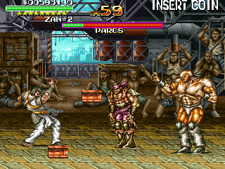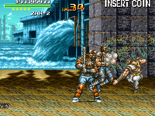 Just a little way in, you'll find one of the showpiece weapons of the game, the steel girder. It's embedded in the ground, so you can either tap the Attack button and lift it out (which will let you use it a few more times, but makes you vulnerable to attack) or just punch it (which weakens and makes it last less hits, but is easier to do). You can either press Attack to swing with it once, or press Attack then tap the opposite direction to swing it round and cover both sides (Matt, being the powerhouse, can swing the girder a lot faster than Zan or Rosa). However, you only get a couple of goes with it (determined by how you got it out the ground) before your character lobs it off-screen. I guess they want to play fair? A little further on you'll find a concrete pole which works the same way, but actually gets shorter each time you land a hit- you'll get less hits out of it if you punch it out the ground instead of lifting it.