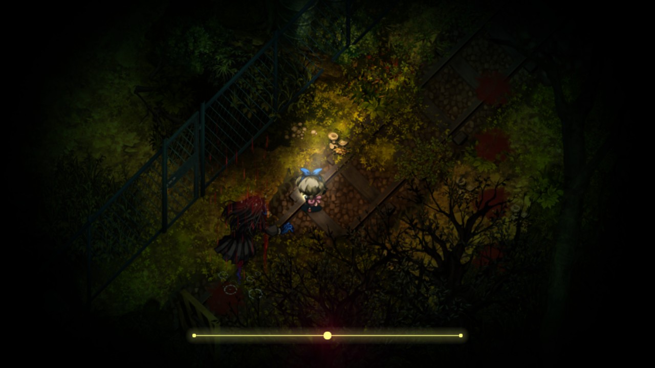 Yomawari: Midnight Shadows does have ties to the original game, but this only becomes apparent after you've been playing for a while, as otherwise it's the story of a different haunted town. Elementary schoolers Haru (with the blue ribbon) and Yui (with the red ribbon) are two friends due to be separated as Haru's family is moving to another nearby town. For now both living in a town haunted by ghastly apparitions at night, they end up separated after watching a local fireworks display in the mountains. Determined to find her friend and keep her promise to stay together, Haru takes up her flashlight and, with the help of Yui's dog Chaco, searches for her at night, hoping to keep the spectres at bay until she finds her. Most chapters also show what's happening to Yui in much shorter segments, but generally this is Haru's adventure into the night. Can she stand up to the horrors that await her and reunite with her friend? Is it too late? Only the shadows know, until Haru fights back until the break of dawn against the monsters in her town.