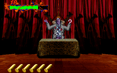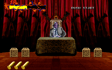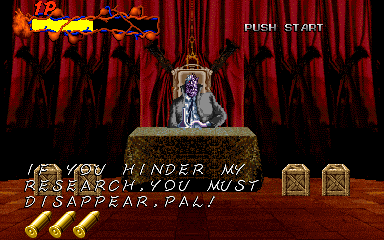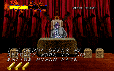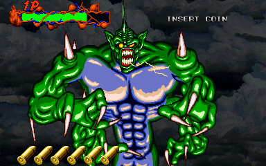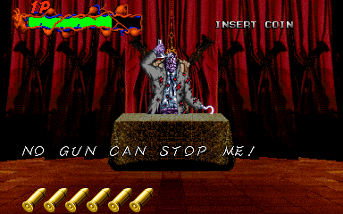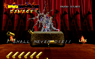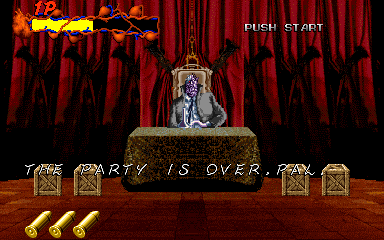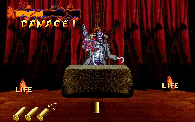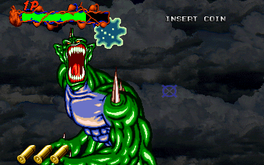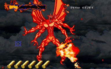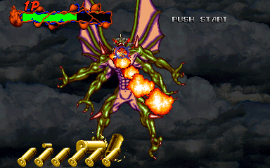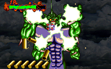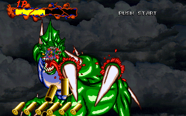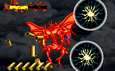 When his health starts to go down, Pal-Beast flies further into the background, and the kid gloves are off- his attacks from the background are brutal, and will almost certainly cost you a couple of lives. His primary attack back here is to spew flames from his mouth, but this attack doesn't count as a projectile, as it can't be shot out of harm's way- it's a flamethrower! Unlike all the other attacks in the entire game, shooting Pal-Beast anywhere won't stop it- from what I've seen, the only way to stop the flamethrower is to shoot him in the head as much as you can. Even if you fill his mouth with enough bullets to put down a small elephant, you'll almost certainly take at least one hit here. If you don't do anything about it, he simply won't stop, eating through your life bar like it's not there. I'd say this is the cheapest attack in the game, but at least it can be stopped...