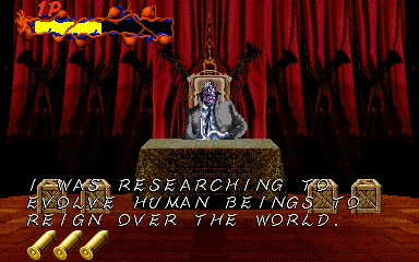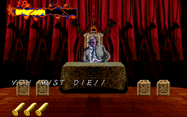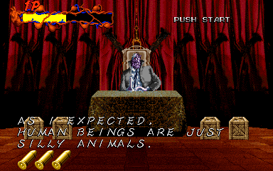OK, so this is the final battle, Pal-Beast Vs. Edward Windsor, and Pal ain't playing fair. His two basic attacks are to spit phlegm at you in groups of four, and to pose dramatically seconds before he stabs you. Both of these are actually really easy to avoid- the phlegm shots are easy enough to shoot, and you can actually stop him from stabbing you pretty easily- but I suspect this is mostly due to the fact that he's an absolutely massive target, and shooting him anywhere counts as a hit.