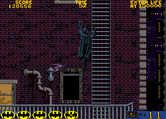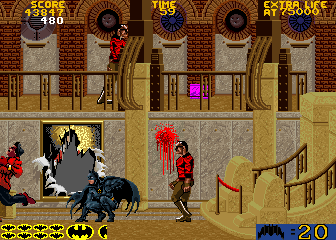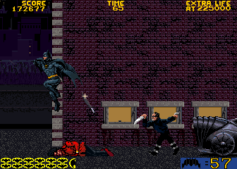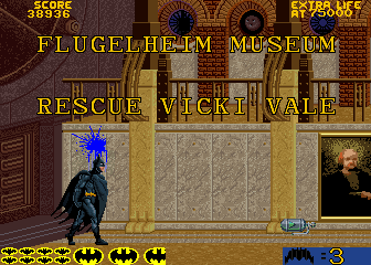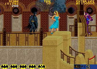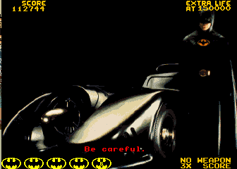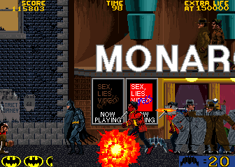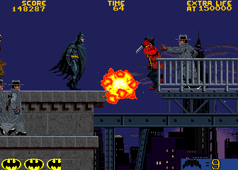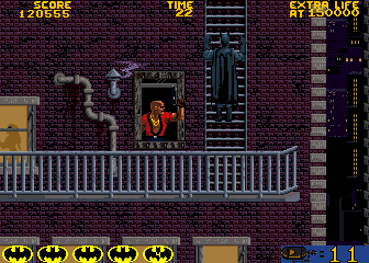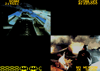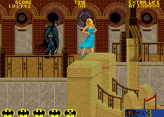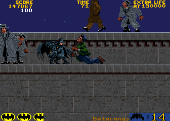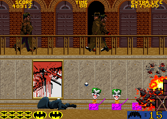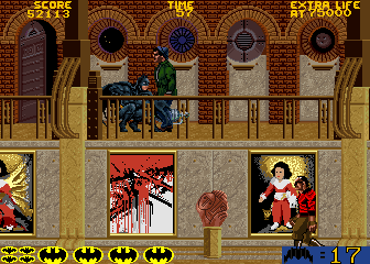 In this segment, Batman is assaulted by all sides while trying to get to his car (it's happened to me on countless occasions, you can't park for a second without gangsters going for your wallet in my town) but he's also assaulted by a series of increasingly hilarious bugs that completely mess up the appearance of the enemies, including some merging together, and others disappearing save for their clothes. Some may cite it as being an emulator bug, but rest assured- "The priority system for this game was primitive. ...[they] suck just that bad." according to the lovely people at MAMEdev. This is precisely how the game appeared in arcades back in 1991, folks. It really did suck this bad.