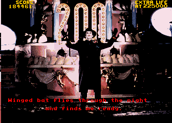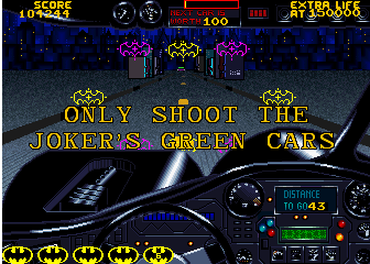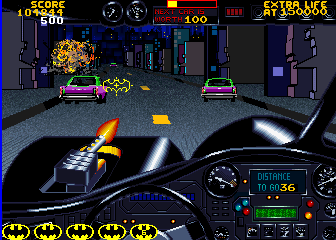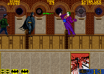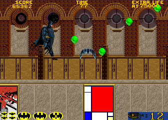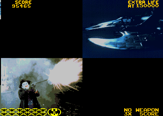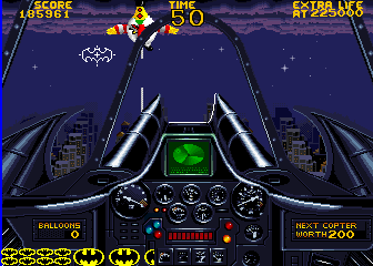 Finally, a decent driving stage. You get to control the Bat Wing this time, as you steal The Joker's balloons and fight off his attack helicopters. You catch the balloons in the centre of the Bat Wing- line 'em up with the middle segment by moving left or right and you'll pick them up automatically. The stage is on a timer, and even if you don't collect a single balloon, you'll go to the next stage when the time is up, as the Joker wails "HE STOLE MY BALLOONS!!!" in your general direction. However, collecting the balloons is fun, and not only do you get 2000 points for each one you pick up, but you get a huge points bonus at the end if you get them all. It's a nice little section, actually, and probably the most enjoyable bit in the game- although it's barely more sophisticated than the other driving sections, it's still pretty fun! Shame that the fun is so very short-lived.
