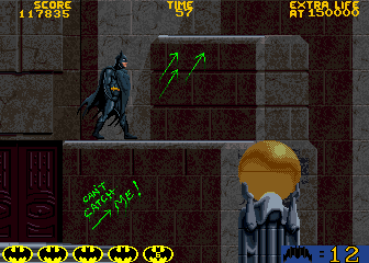 Oh my, what a turn of events! The Joker uses his absurd pistol to take down the Bat Wing, and now Batman has to find him in a cathedral. I was hoping that I'd be able to fit the next level on this page, but no, it was going to make this page go on forever. As such, I had to take so many pictures dedicated to its utter failure that it had to be given its own section to save you from a dreadful fate of having about 30 pictures shoved down your throat on one page. Let's just get this over with.