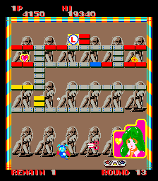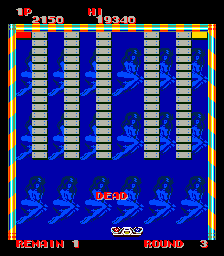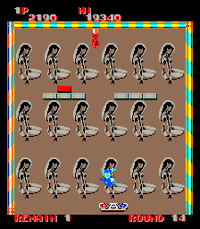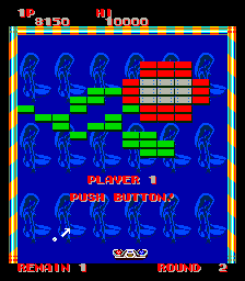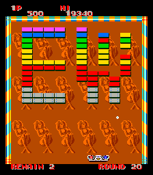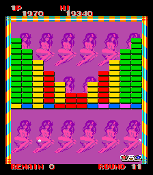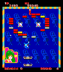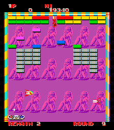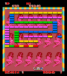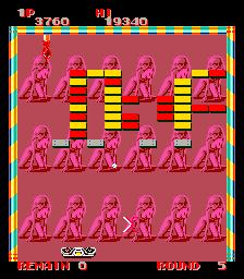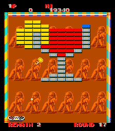 Now, busted gameplay would be bad enough, but Block Gal ups its game with its wretched round design. Sure, there's only 20 of them, but they commit nearly every Arkanoid design sin imaginable. There's rounds with single blocks at the top of columns made out of indestructible blocks (a pretty big sin), blocks placed in really awkward places that take over 5 hits to destroy (a very big sin), the very idea of differently-coloured blocks that take up to 8 hits to destroy (probably a violation of the Geneva convention) and worst of all, the dreaded lever- a strange red thing at the top of certain rounds that sends your little ball careening back down to you if it so much as looks at the lever in a funny way. Naturally, the lever nestles itself on the ceiling of all the rounds where you don't need it. Specifically, you'll find it on all the rounds where getting the ball up to the top of the screen is extremely difficult, so the lever simply makes you do it all over again, or you'll miss it if you're lucky... Then you'll have to try it again, because the block you were trying to hit needs to be hit 5 more times. Gaaaah. These rounds are simply designed to annoy you, I swear! This nonsense drags the whole trainwreck on for longer than necessary, and every time I've tried to play the game after writing (most of) this article I've ended up shutting MAME down and punching a nearby wall.
