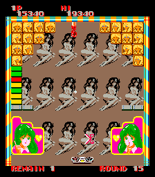 It's not that it's bad out of a lack of effort, mind you, because despite its gutter-trash premise (which you can probably guess from the title alone) there's some pretty neat ideas in here. Block Gal isn't very subtle, however- it's a blatant rip-off of Arkanoid (which of course is a rip-off of Breakout but don't tell Atari) which came out in the previous year, pinching the gameplay basics and adding a few twists of its own. On the off-chance that you haven't played Arkanoid, or Breakout, or Prism Land Story or anything like it, then I have to ask which rock you've been living under for the past 20-odd years. For now, I'll humour you- you control a bat with a analogue paddle, and you've got to keep the ball from falling past the bat while trying to destroy all the blocks on the round by smashing them with the ball. You can also pick up power-ups in each round to help you out (see, this is what makes Block Gal a clone of Arkanoid and not Breakout). Clear the board of all blocks, move on to the next round, lather, rinse, repeat.