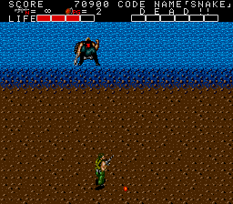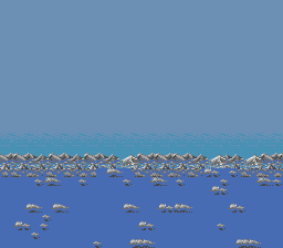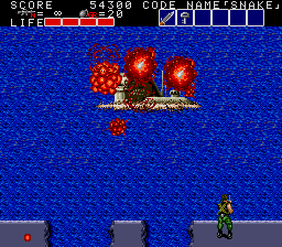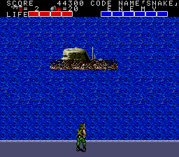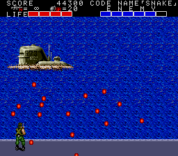 The Mega Sub (for that is its name in the manual) has two attack phases, and only one of those gives you the opportunity to damage it. It starts by surfacing- sadly, every emulator I've tried the game in has issues with graphisc priority in certain places, so the sub appears incorrectly here- and then launches a scattershot pattern of bullets at you. Carefully manoeuvre through the bullets and wail on it- if you picked up the Bazooka earlier, this won't take long. After you take out two of its health blocks, it'll submerge, try to line itself up with you, and fire a missile. It moves pretty slow so it's easy to get out of the way, but the missiles will destroy the part of the platform it hits, reducing it to water- touch it, and it's instant death. After three missiles, it resurfaces and repeats the pattern.