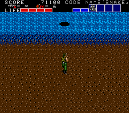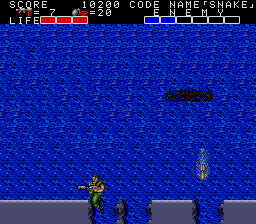Anyway, the next section's your first taste of moving in water. It's much the same as walking on terra firma, but you're a lot slower, and you can dive underwater for a brief moment to avoid bullets and explosions by pressing Jump- just don't walk into enemies when submerged, as it'll still hurt, . If you forgot to grab the fins earlier, your underwater speed's the same as above the water, so it's not very useful. With the fins, underwater movement is a lot faster, so I hope you didn't forget to pick them up. The enemy appears in sizeable numbers here, including machine gun guys, so be careful, especially at the end of the horizontal section- if you're close to the top of the screen when it ends, the screen will snap upwards for the next vertical section, bringing a load of enemies on-screen! You don't want that to happen, especially since there's machine gun guys amongst them, so watch out for that.