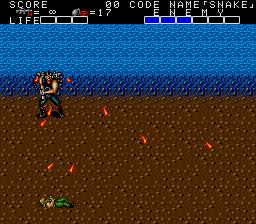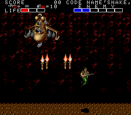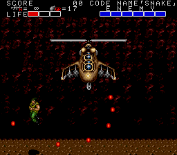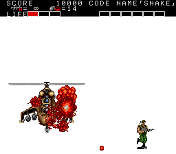 Anyway, it's the now-obligatory clifftop showdown with an enemy flying vehicle- in this case, a helicopter- and this one doesn't play around. It moves fairly slowly (although it'll zoom off screen at some points, so you have to wait for it to reappear) but has two attacks, both of which are pretty deadly, and it often uses both at once. The first is a barrage of four missiles that don't have great attack range- all four missiles hit almost the same spot- but they'll do two blocks of damage if you're caught in the explosion. The second is a slow spread of bullets, as shown above. Much like Flamethrower, you basically don't want to be directly in the chopper's lien of fire, 'cause that's where the missiles usually hit, and they hit hard, but staying to its sides also makes it easier to dodge the spread fire. Attack it when you can, but don't stand right in front of it otherwise it'll catch you with its missiles. On the plus side, when it's close enough, you can nail it with grenades, so do that when possible.