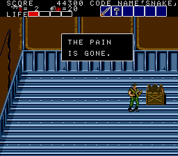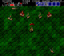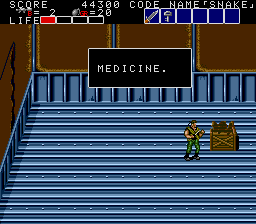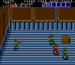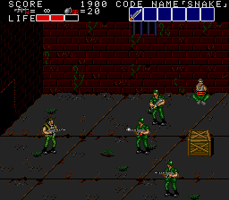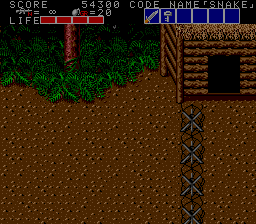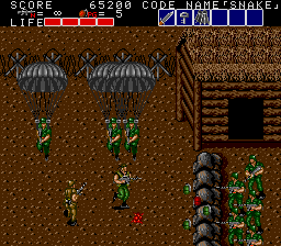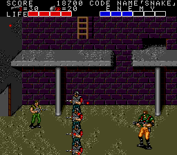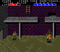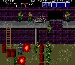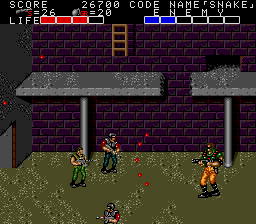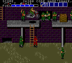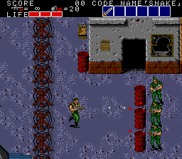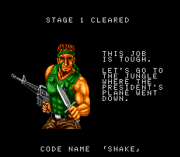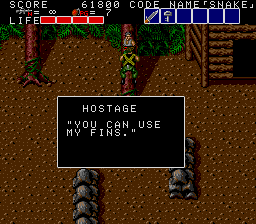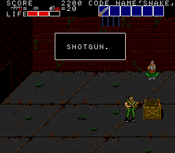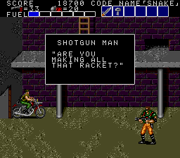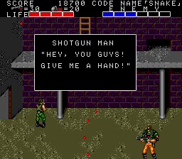 All these indoor sections fit on a single screen, and usually contain a mixture of hostages who occasionally give you intel of varying levels of usefulness, crates with essential supplies inside (use your close-range knife attack to open them), in rare cases a motorcycle, and a gaggle of enemies to take out before extracting the goodies within. As a warning, though, grenades and bazooka rounds will destroy crates and kill hostages, so only use close-range attacks to deal with the enemies in these rooms! You'll see hostages and crates in the open areas too, but these rooms usually have the best tat, so it's important you check every door to find them. Anyway, the hostage here is the master of starting the obvious, but the crate has a nice present for us, at least- the good ol' spread fire Shotgun!