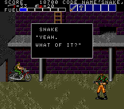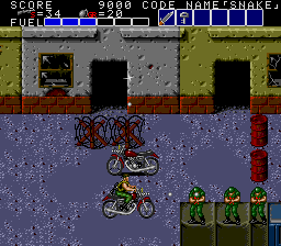 The rest of this opening area is as basic as you get- just keep moving along and plough through the enemies. It's even easier if you can pick off one of the motorcycle guys to steal their hog- one appears just after the first truck (which has a hostage on top of it that has the Key for you- not strictly essential, but you'd be best to grab it anyway). After the rider's dead, just walk up to the cycle to ride it, and you'll storm through whatever the enemy throws at you, either with its mounted machine guns or just plain ol' running people over- you're basically invincible, but each hit you take chops away at your fuel. You've got a decent amount of gas to start with, but once it runs out, jump off (press Run) because it'll start flashing and explode soon after. If you're too slow, you'll go with it!