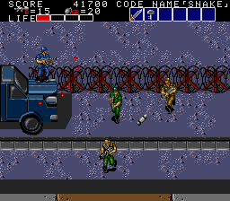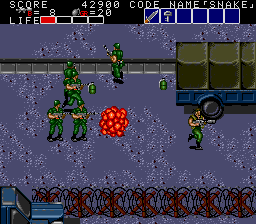 This vertically-scrolling area has the first appearance of the yellow soldier- they flash (as in flash yellow, not that kind of flashing) and they explode when shot. Obviously, they make a beeline for your position the second they appear on-screen, so shoot from a safe distance- as a bonus, when they explode, they'll take out any enemies near them. Once he's dealt with, walk up to the back of the truck...