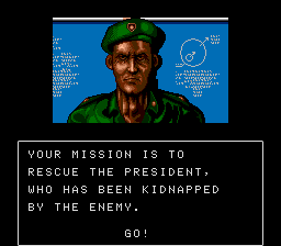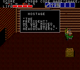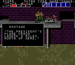 The rest of this section can be a little tough, as a lot of it involves enemies on higher platforms raining grenades on top of you. You can't shoot at them from the ground, but you can grenade them... The easier way is to grab the motorcycle that's on top of one of the platforms and carefully drive across the platforms. If you press Down at any point, you'll fall to the ground floor and won't be able to get back up, which is a problem as grenades take the cycle out in one hit. If you can stay up there, though, this section will fly by, and you'll also get some goodies on the way- there's a Bazooka in a crate which will help with the upcoming boss battle, and a hostage has some essential information for you, as you can see above. So that's where the President is? We'd better get a move on, then.