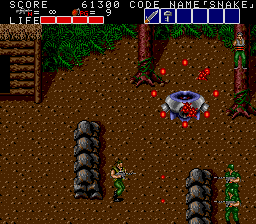 Once you start moving vertically again, the river gives way to a small grassy area- you'll still move slower in the grass, but you can jump freely now. This would be a fairly tough area, seeing as it's got a few more machine gun soldiers... But just before you enter it, there's a crate with a Shotgun in it, which makes short work of anything the enemy throws at you. Once you reach the end...