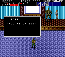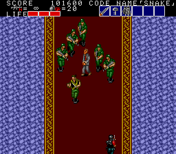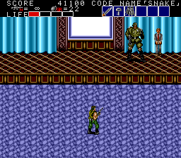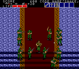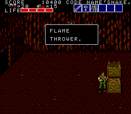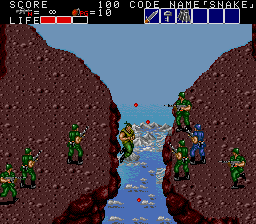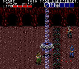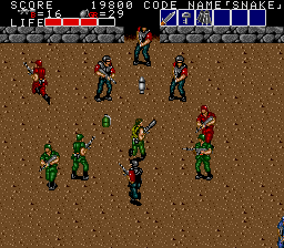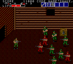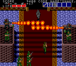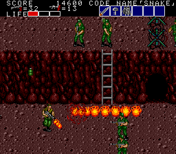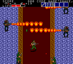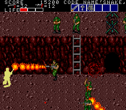 The main threat here comes in the form of a squad of deadly flamethrower guys. They cover each side, and they're staggered vertically so they cover a lot of ground. Yes, their flamethrowers are just as lethal as yours, although luckily they only fire them in one direction, horizontally. Pick a side and take these guys out with your Bazooka before moving forward. The other guys around here are just small-fry in comparison, so deal with them and move on... Except for one guy. Standing in front of the door to the stage's boss is a completely grey-scale soldier (who I'm certain sometimes, if rarely, appears in the previous section, but I can't get him to spawn again) who I call the statue soldier. By far the sturdiest 'standard' soldier, they cannot be injured by knife attacks, and can withstand two to three grenades before snuffing it. Good thing there's only one of them here, then. Consider it practice for later.