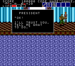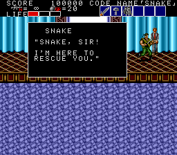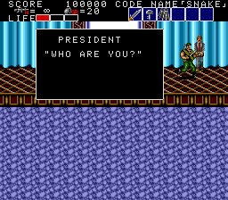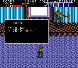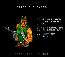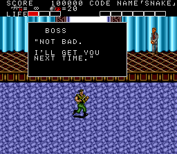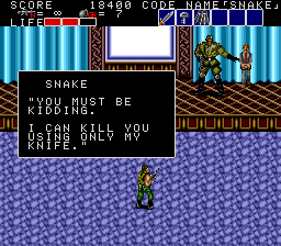 As you just saw, your gun's been trashed by the enemy commander's boomerang- yes, that is something I just typed out- so this is one of a few sections in the game where you're down to just your knife. Apparently the commander stole your secondary weapons too, so no Grenades (or the Flamethrower if you still had one from the previous stage) either- this battle relies purely on your knife skills. As a fairly unsporting chap, the commander uses his highly advanced weaponry on you while you're unarmed- he starts with a spread of five boomerangs that move slowly but will make their way over to you eventually, then after two of those, he'll start firing his cannon, aiming for you while it charges up, then hopping to another part of the screen and firing again. Like the Big Sniper, this one has an audio cue (the same one, actually) but it's a lot faster, so you've got less time to react. After a few shots, he'll go back to his boomerang and repeat until he's dead. Or you're dead. Whichever.