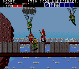 Even with a health top-up, though, the next section can be tough- it's a narrow bridge that's been poorly maintained as it's got lots of holes in it. You slip up, it's instant death. As well as enemies walking in from the right, paratroopers will swoop in from the top of the screen, and while they' can't hurt you until they land, they can still be distracting and make you fall off out of panic. Your best bet here is to inch across the bridge, taking out any enemies on screen before jumping over gaps- you really don't want to die here, as losing the Flamethrower makes the boss a bit harder.
