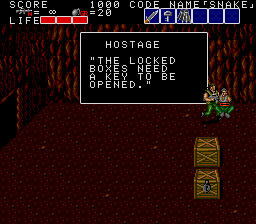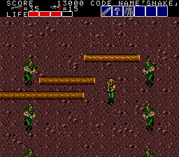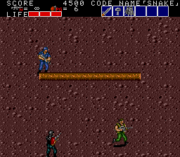First up, there's a crate out in the open at the very start, so open it for some Powerful Grenades. Now, the mountains have probably the most 'platforming' bits in the game, but they're not much bother- generally, judging where you're going to land from a jump is easy, it's just the hit detection with bullets and jumping that this game gets wrong! After the first gap and a ladder, there's a long vertical trail where that old foe of mountainous stages in video games comes to give you what-for. You know who I'm talking about, right? Falling rocks! Except instead of rocks, it's falling logs. Coming in a few different sizes, these roll down from the top of the screen, and instantly kill you if they ram into you and you don't have more than three health blocks. You can damage them, it seems- they flash if you shoot them- but even a Powerful Grenade won't destroy them, so don't waste any effort. Just jump over them instead.