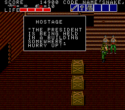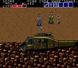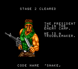 Bad news! You've got to get the President out of here through the remaining enemy forces, and your gun's still broken so you gotta knife it. Good news! You can mostly just peg it and don't need to worry about your Commander-in-Chief. While you'll want to take out as many soldiers as possible- in particular the machine gun soldiers and the armoured guys- you can actually zip past at least a few of them. It's a good thing too, as the collision detection for going down the screen instead of up is weird- you can usually hit enemies before you think you can, and the same goes for them hitting you. Additionally, while the President will lag behind if you don't wait up for him, he won't die or anything- he'll be fine! He's the President! So, basically, just bomb your ass down the hill and eventually...