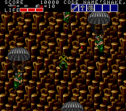 The bad news is Stage 4 starts with a sorta-unfair section- a mountain climb. A big mountain climb. Climbing here is the same as it's been in previous stages, but what you'll notice here is you can't move left or right- only straight up. As you climb, enemy paratroopers will start to float by, and if they're a certain distance from you, they'll fire, so you can only dodge by moving up and down! At the very least, running into them won't hurt you, it's just their bullets. If you start climbing in the cetnre, they'll fire less at you... Problem is, once you get to the top, a soldier will be waiting for you, and since he enters the screen from the middle, you basically can't avoid him. If you try to approach the cliff from the side, the enemy is far more likely to shoot you and actually hit you. So, you're gonna take a hit, no matter what you do. Bit of a shame, that.
