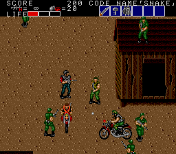 After a few more soldiers, there's another shack ahead- as well as several hostages, you've got three crates to choose from. The top crate has Grenades, the middle one has a Bazooka, and the bottom one has a Shotgun. Outside the cabin, a few bikes will appear, so it's tempting to take the Shotgun so you can kill the riders and nick the bike- Bazookas will kill both the rider and trash the bike- but when you exit this area, you lose the bike anyway, and there's loads of armoured soldiers in the areas to come. Go for power over range, trust me! In what's left of this area, there's a few machine gun soldiers and armoured guys, but otherwise getting to the base isn't too troublesome. Just walk right through the front door!