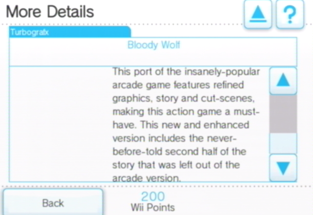 Sadly, Bloody Wolf was one of several PC Engine Data East-sourced (and G-mode-owned) games on the Virtual Console to be delisted from the service in all territories in March 2012- the US and EU shops also lost Silent Debuggers and Drop Off, while the JP store lost those and Makai Hakkenden Shada, Override and Winning Shot. That's a real shame, as it was the widest release the game got (and its only proper European release). Ah, the perils of digital download services!