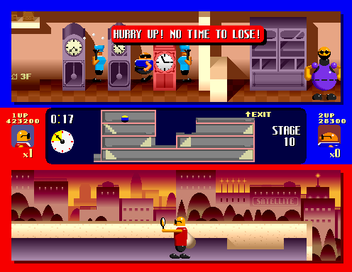 How does it go about doing so? The flyer bills Bonanza Bros. as a "Comical 'Reaction' Game" which is, well, a little vague, but it does clue you in that it's going to be a somewhat different approach (the flyer also has perhaps one of my favourite arcade flyer sentences, "HERE WE GO, YOU GANG OF CLOWNS!!"). Across the game's 12 locations (10 in the Mega Drive port), Robo and Mobo have to steal specific treasures noted on the map of each stage before they're allowed to climb the stairs to the exit. All the while, the boys will have to avoid security forces dotted around each locale who will, upon sighting them, either chase them, club them, shoot them, bite them (there's dogs about, you know) or even lob bombs at them, all of which take a life away. Luckily, the boys have some tricks up their sleeves, notably the ability to move between two 'lanes' in each stage, one in the foreground and another in the background. This doesn't sound like much, but it can be essential in navigating hazards like trash left strewn about, and for outmanoeuvring guards as they'll try and follow you, so with some deft joystick-wiggling you can give 'em the slip! The boys also go to each job armed with a gun, but this only stuns guards temporarily (they're professionals, not assassins) and while there's another way to incapacitate them- slam a door in their face, but watch out because the same can happen to you- you generally want to avoid detection until the last possible moment so you can let those guards take a lil' nap and make a quick getaway! 'Avoiding detection' is harder than it sounds, though, as the game's a little vague on when guards can spot you- they definitely look from left to right as all good video game guards do, but sometimes they'll just see you anyway, but we'll explore that a little later.