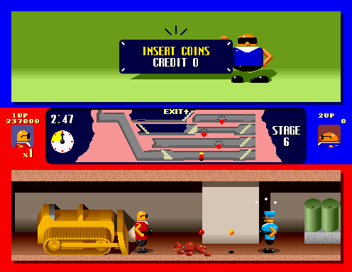 You know what, I'm happy I've got this to deal with, no, truly, it's the highlight of my day- we're dealing with two games that have almost completely different native resolutions! And we're playing them both at the same time! Oh joy, oh joy, and I'm the hapless jackass who has to sort all this image bullshit out! Bloody hellfire. So, the arcade Bonanza Bros. uses a medium-resolution display which outputs from MAME as 496 x 384, translated to English the size of that is bastard massive compared to our normal guff, and much much bigger than Mega Drive shots. So, we thought of a few ways to try and tackle this, and settled upon the obvious one- keep the two versions separate. So we'll talk about the arcade version while showing those screenshots at 80% of their original resolution (they're flippin' huge otherwise, click to make them bigger) then switch to the Mega Drive port with appropriate screenshots. Not the most elegant solution in the world, but problems arise if we try to change the size of things to keep them exactly the same- shrink the arcade screenshots and you can't see anything that's going on, blow up the Mega Drive screenshots and they don't look great and they're still not exactly the same size anyway...