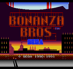 However, we can't start just yet. Normally, I'd just pick the arcade version and be on my way, but I think the Mega Drive port- developed by I.T.L. for Sega and released the following year, 1991- is worth examining at the same time. Don't get the wrong idea, Bonnza Bros. was not quite one of those Sega Mega Drive ports, where there were sweeping changes from the arcade game to the point where some of them aren't even the same game. Some of these were more extreme than others- Alien Storm had an almost completely new set of levels, and some like Shadow Dancer and ESWAT were basically sequels instead- but while Bonanza Bros. is mostly the same game, it has a fair enough number of differences to warrant playing both versions side by side. On the surface, the Mega Drive port is very similar, with some bits cut- specifically, the Department Store and Antique Store stages were removed, as were the Bonus Stages (all that remains are some of their musical cues used in the new intermissions)- but as we shall hopefully demonstrate there's some more subtle changes that alter the feel of the game considerably.
