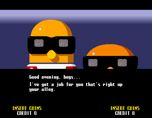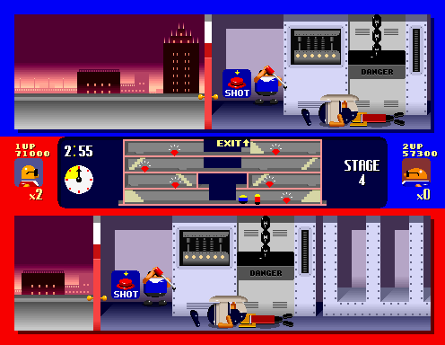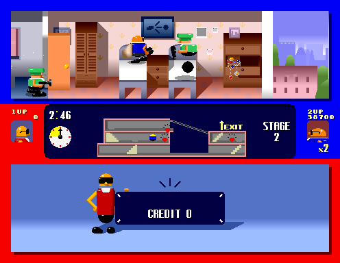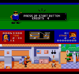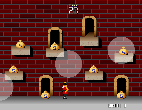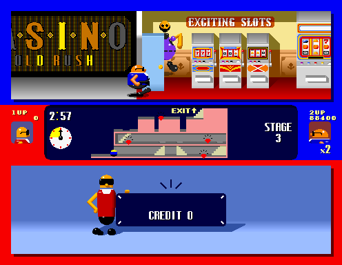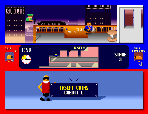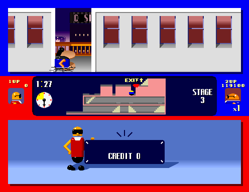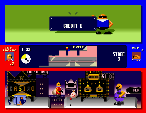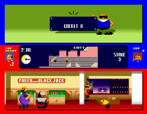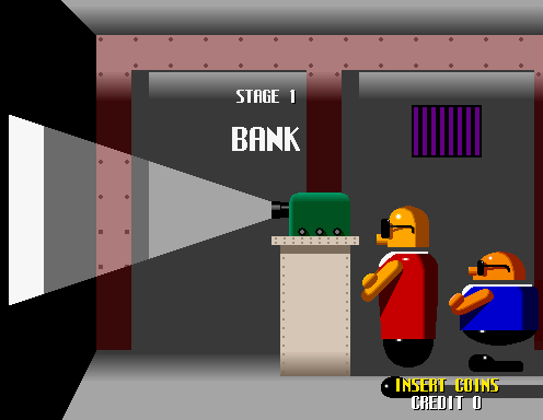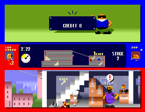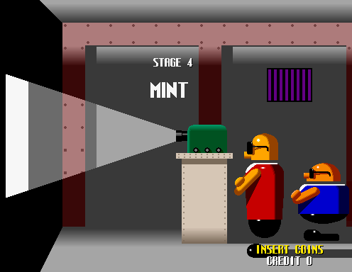 I imagine this was included because for an arcade game, Bonanza Bros. isn't exactly pick-up-and-play, and the idea of playing stealthily, rather than going in guns blazing, might take a little getting used to. So, this straight line of a stage very gently introduces some of the most basic mechanics- opening doors (and as a bonus, showing you that you can swat enemies with 'em), moving between the background and foreground, leaning against pillars, and taking advantage of when enemies are looking the other way or taking a nap. If nothing else, Sega was a little forward-thinking here- the Training Stage can be safely skipped as you don't get any points for going through it, but it's still there as an option in case you're new or haven't played in a long time. There's commentary to be made about modern video game tutorials and instructions here, but since when does Gaming Hell play modern video games that don't involve virtual idols? Never. The answer is never. Probably.
