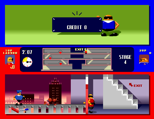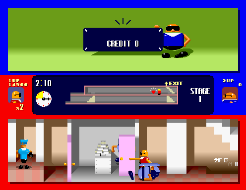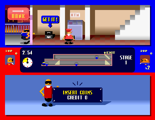 First, take a moment to see how it made it over to the system in terms of looks- that resolution reduction is pretty steep, and the smaller amount of colours means that the reliance on gradients in the arcade game had to be pared down. What you can't see here is the animation, which is less smooth across the board for the characters. Still, it tries its best to replicate the aesthetic of the game as best it can, so let's move on to what else has changed. The well-built guards have been swapped out for palette-swaps of the stout guards, but while they're still armed with guns they're slightly less dangerous- rather than shooting you immediately, they'll usually fire in the air to alert other nearby guards first, which does get them on your case but gives you precious seconds to get in position to retaliate. As for the stage design itself, the main change is that a fourth treasure has been added to the left of the second floor, so when playing solo you have to cover more of that floor by yourself- it's probably easiest to hop up the stairs, grab the newly-added treasure, then hop back down and beat the stage as you would in the arcade. Finally, probably to make it more obvious this place isn't a bank, the safe by the door has been replaced with an arcade cabinet! Definitely a positive change- money won't make you happy, but arcade games will.