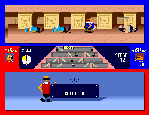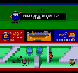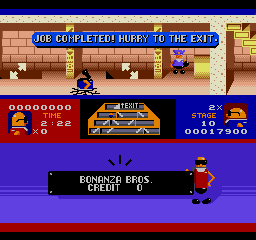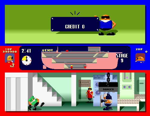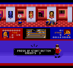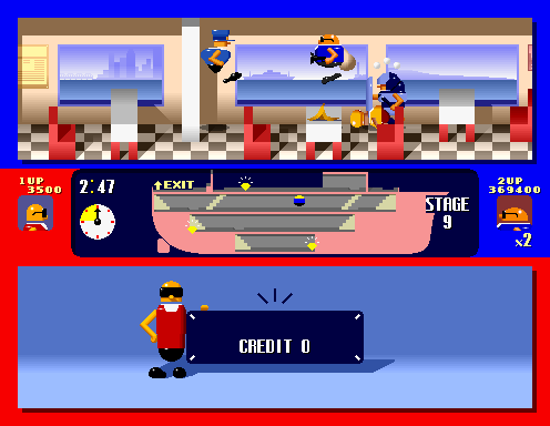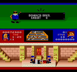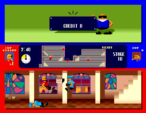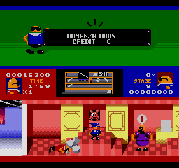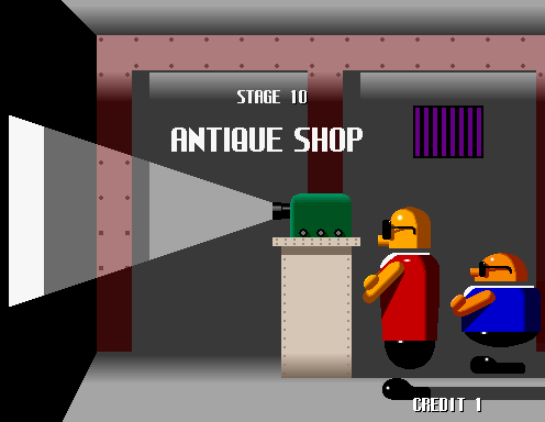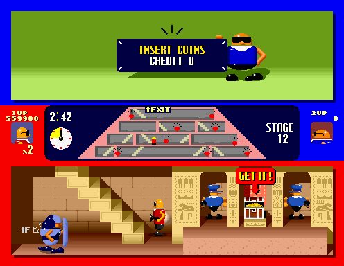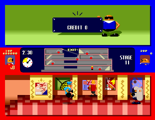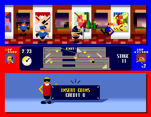 This is actually a nice and breezy stage- probably my favourite in the arcade- when you know what you're doing, as it's less densely populated for the most part. The main problem is the treasure on the very top floor, which you really have to go out of your way for, and the right side of the building, which has a couple more troublesome guards. At the start, you'll want to grab the treasure on the first floor, then be careful going up the stairs- try to avoid being spotted by the lean blue guards, otherwise you'll have a little gunfight on your hands. Catch them when they're not looking, then head up the stairs and evade the shield guards to get to the clock room. Again, you've got lean blue guards to deal with, as well as a bomb-thrower in the corner by the treasure, but leaving isn't so bad- the high block stops the blue guards' shots from hitting you, just make sure the bomb-thrower's taking a nap as you exit. Head back down to the spring on the second floor (grabbing a treasure on the way) to get to the right side of the building, grab the treasure in the accessories department on the second floor, then make a break for it! Watch out for the low ceiling in the last corridor too, you don't want to try and dodge bullets underneath it! If you're in co-op, things are a little easier- one player can go for the top floor clock and the other can head the long way around for the accessory on the right side, but approaching from that side will probably lead to them being spotted by a stout blue guard who raises the alarm- that player's on their own for that one! As for why this stage was not included in the Mega Drive port, I imagine it's similar to the reasoning behind the Department Store- a lot of different departments requiring unique graphics, combined with the slightly more normal setting lead to it being cut.