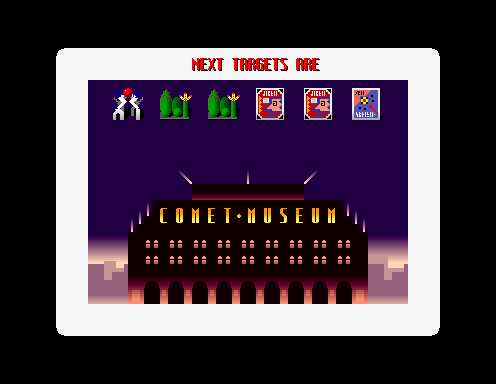 This stage is once again largely unchanged for the Mega Drive port beyond the stuff you're used to at this point, but there is one very significant aesthetic change- the gallery's exhibits. I'm guessing the developers figured that the rather nice abstract art pieces from the arcade game were going to be completely ruined if they were brought over to this port- the reduced colour palette and screen resolution would just do the poor things a huge injustice. So, they had to be thrown out, but in their place is teeny-tiny art referencing a large chunk of the Sega-published library of the Mega Drive in its early years! Well, Sega-published in Japan anyway, an important distinction for reasons we'll see shortly. Presented in a nice little table format, in the order you encounter them, the art exhibits are...