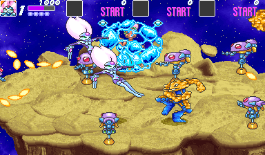 As a whole, the mechanics work OK. It doesn't seem like you have much, but what you do have is useful- floating is very helpful for getting around enemies and bullets, the Gimmick Weapon's purpose should be obvious, and then there's the jump kick which warrants a closer look. It doesn't do a huge amount of damage, but it can move you across the screen quickly and, crucially, gives you some invincibility frames when it connects with something. The utility of this is huge, ranging from hitting an enemy then going back for another hit quickly, diving into a group and diving out safely, and letting you pass through enemies to get behind them (useful on the Prototype Void Droid fight in Stage 5). However, the input for it is very fiddly, either happening when you're trying to float and dodge stuff and you have to shoot at an enemy, or worse, not coming out when you need it, which is a shame as otherwise it'd be very helpful. The real issue with control comes with this game allowing you to move in and out of the screen, as it makes things like when you're going to get hit and when you can hit the enemies seem unnecessarily vague and nebulous. You will absolutely be hit at a point when it seems like you shouldn't be, which is pretty infuriating! Some low points include Stage 4 with the asteroids that can blindside you and the vehicle-based Stage 6 which we'll get to later, but it means that the game feels a bit fiddly to control and effectively avoid enemies at points. I think the large size of the sprites and the amount of room you have to move across the screen is a factor too- the opposite of Konami's own Aliens game with its smaller sprites and play area, meaning there's far less vaguery and guessing to where you are in relation to enemy threats. There's also no jumping in Aliens, nor are there nearly as many bullets fired by enemies, which this game has in spades.