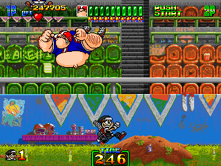 Bear is actually one of the easier bosses, mostly because he's got no projectiles to speak of, aside from his smaller football-playing buddies, who'll sometimes wander on screen to be thrown at you like a rag-doll. No, he uses the power of his mighty beer-belly, with the force of a thousand locomotives behind it, to destroy you! His main attack is using said belly to bounce around the screen to try and squash you, homing in on your last location. He'll also fly around on occasion, using only his arms to maintain flight- when he does this, he'll eventually make his way into the background, landing on one of the seats in the background (where he's been sitting for the majority of the stage, simply pigging out on ice-cream), then jump back to the foreground, slamming into the floor and stunning you if you happen to be standing on the floor when he lands. Finally, he'll try an E. Honda-style torpedo attack, launching himself at you and flying around the screen at different heights.