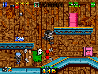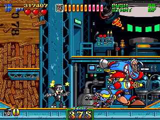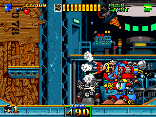 So, naturally, Stage 5 takes place in a typical mad scientist's lair. You know the type. Lots of conveyor belts both in the background and the foreground, various science-type flunkies armed with rayguns, lazor beems mounted to the ceiling, and, for some reason, the generic ninja enemies back from Stage 3. It's pretty standard stuff, ripping pages directly from the 'Scientist's Lab' page of the Generic Platformer Guidebook. However, one of the enemies is not one you'd particularly expect to find in a mad scientist's laboratory...