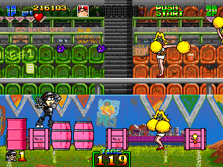 The main enemy on this stage is actually this cheerleader character, firing out purple kisses that damage you.