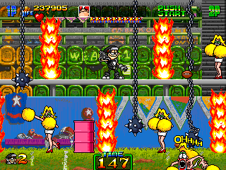 After that, the level proceeds to get a little crazy with the rampant fires and the giant mace balls. Keep in mind that this is supposed to be a football field, not a death trap. People are supposed to play and watch the wonderful past-time of American football here, not get horribly skewered by random spikes and set ablaze but then again, what do I know? Anyway, the game perks up from the slump in Freddie's stage and kicks things back into 'Hectic' as there's lots of danger, in particular the mini football players who litter the stage with football bombs, the cheerleaders flinging kisses of death your way, and the rest. I'm not going to tell you to take it slowly here, because that'll give the enemies ample time to run on screen. Just dash through and you should be alright.