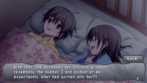The sad thing is that there are bits, just little parts, where the story works! Far and away the best chapter is Chapter 5, which flits between Moreshige, one of the Kisaragi Academy students who disappeared in the first game while becoming oddly entranced by the corpses littering the halls, and survivors from other schools, most notably Hellgirl Mitsuki and Nana's friends Nari and Chihaya. Seeing the school from Moreshige's perspective is really interesting, and even though I wasn't keen on him the first time around, he grows on you because of how he sees the place. Additionally, Nari is the most switched-on character in this one as she gets right on to Moreshige's creepiness and takes zero crap from anyone... So it's a shame that you only control her for five minutes. Chapter 2, starring Mayu, is also one of the stronger ones as it's got more screentime for her- she wasn't around in the first game for too long, so even if she spends half her time pining for Moreshige and the other half pining for the fjords of her youth (no, really), it was nice to get a little time with her (and it helps that Yoshiki's in this chapter, for he is the best). The final Chapter, the prologue for Blood Drive, is also a highlight as stuff actually relevant to the canon storyline happens, although if you don't have a Corpse Party save file on your system, you may never see it- without it, you have to get all the Wrong Ends in the game to unlock it, and if you don't have the patience for that, I don't blame you (although you really need to play the first game to even understand this one- you can't bluff your way through!).