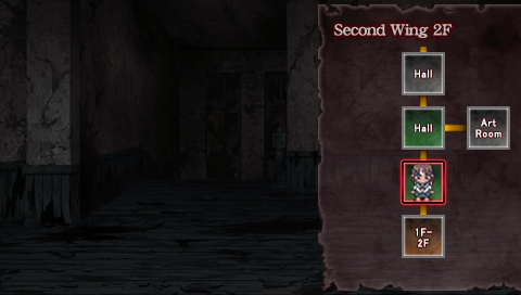 As I said, the 16-bit RPG aesthetic is ditched for this one, save for the sprites that appear on your map. Instead, this is much closer to a traditional visual novel, but with some elements of the first game still lingering around. While the traditional RPG exploration is gone, you instead get a map of the school with hallways and rooms as single blocks you explore in a first-person search mode with a point-and-click adventure-style cursor (beyond items to progress, you can still check corpses for student I.D. tags- gotta catch 'em all!). You're free to go wherever you like via the map, but you'll automatically be stopped if an event happens like an earthquake or someone new shows up. There's also a new mechanic that fits right into the Corpse Party vibe with the Darkening meter- as you see corpses or strange phenomena in the school, this meter begins to rise and takes its toll on your character's sense of reality. The higher it is, the more obscured your vision gets, with blood-splotches starting to mask the screen, and certain events can happen when your Darkening is at a certain level... But should it reach 100%, you die and get a Game Over (not a Wrong End, except in one chapter).