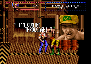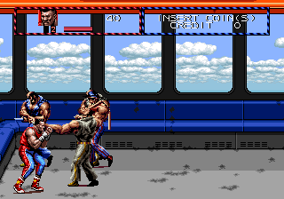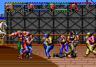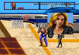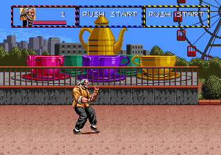 Another point against the game is the level design itself, as while there are some visually impressive parts- the theme park ride that swings wildly during the Stage 1 boss fight, the tram that takes up most of Stage 2 and shows you the entire city- there's almost nothing to them beyond mooks. No destructible items outside of one bonus stage, very rare knife and grenade drops, and life-ups are literally the words 'LIFE' and 'MAX', missing the charm of trash meat and road cone apples. Many of the backgrounds aren't great either, lacking the care and love given to the character animations. There's only really two environmental hazards, even- a hole in Stage 2, and conveyor belts and gaps in Stage 6- and so adding in the lack of interactables and proper weapons, the stages feel barren and flat. Most infamous is Stage 4, which starts with a bizarre guessing-game (pick left or right to land on the boxes or take damage) and quickly segues into the dreaded Fire Escape, three floors of nothing but brick walls and a very-slowly scrolling screen that keeps filling up with bad guys every few pixels, that eventually has you defeating over one hundred enemies before you make it to the bottom. If you're struggling with the game, this won't make it any easier for you. At least the game knows to keep the inevitable boss rush short- no mooks, no parts inbetween, just a straight gauntlet of bosses before the final boss.