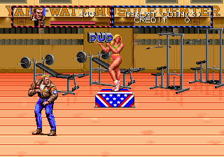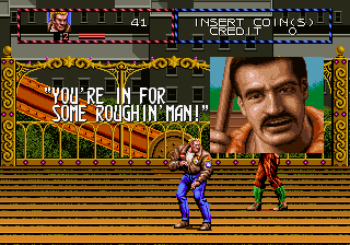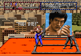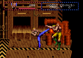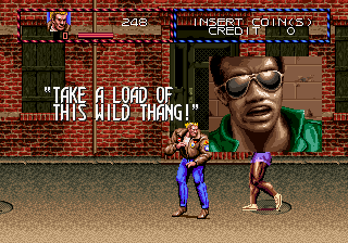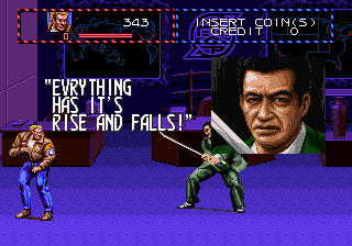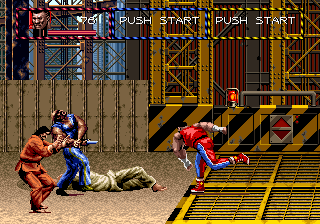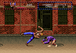 As I said, people bounce off this game hard because of how unintuitive it is, and this is something evident from the opening moments, with no quarter given. Yet, while the game brutalises the player from the off, with no easy-going first stage to ease you into its weird foibles and mechanics, it doesn't get particularly more difficult or change too much as time passes, so once you get the hang of things, you can apply it to most of the game (assuming you pick F.F or King, generally regarded as the best characters for their attacks- Buster is more viable, don't play as Gung-Ho, is what I've learned from the masters). There are only five (5!) basic enemy types (introduced by the start of Stage 3) but to its credit it does its best to make them as varied as possible, even amongst colour variations of the same enemy type- red judoka have a lethal dashing kick their white counterparts lack, and the gold knife guys are the most dangerous enemies in the game as they're very fast and will rush you with a flurry of stabs. However, the fact that enemy groups only ever come in fours and will often consist of the same enemy types does mean mob construction and variety is a little weak. On the plus side, the bosses aren't too bad... When you learn their patterns, anyway. They'll crush you on your first time, but once you figure out their easy-to-exploit behaviours, they're a welcome breather from the rest of the game. The lady in Stage 3 seems impossible at first, for instance, until you realise you can bait her to jump, and the jump she does after reaching the end of the screen leaves her vulnerable afterwards, and Stage 4's breakdancer always does a high jump before breakdancing and that he can be hit near the end of that attack. Stage 5's boss though, you're on your own for that guy (not to say there are no strats for him, he's just rough).